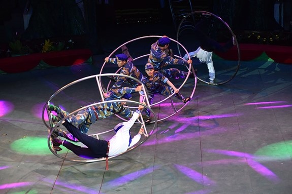 Tiết mục ứng dụng hệ thống âm thanh, ánh sáng hiện đại vào biểu diễn của các nghệ sĩ Liên đoàn Xiếc Việt Nam.